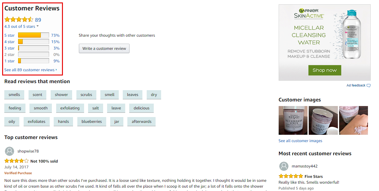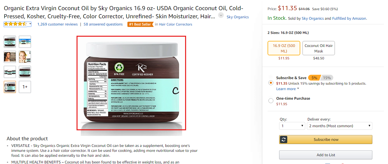 Карточки товаров на Amazon.com содержат максимально подробное представление продукта. Это касается не только описания, но и фотографий товаров. Например, пользователю доступны развороты всех этикеток с упаковки косметических средств и продуктов питания, за счет чего покупатель может подробно ознакомиться с составом продукта, его производителем и способом употребления до совершения покупки.