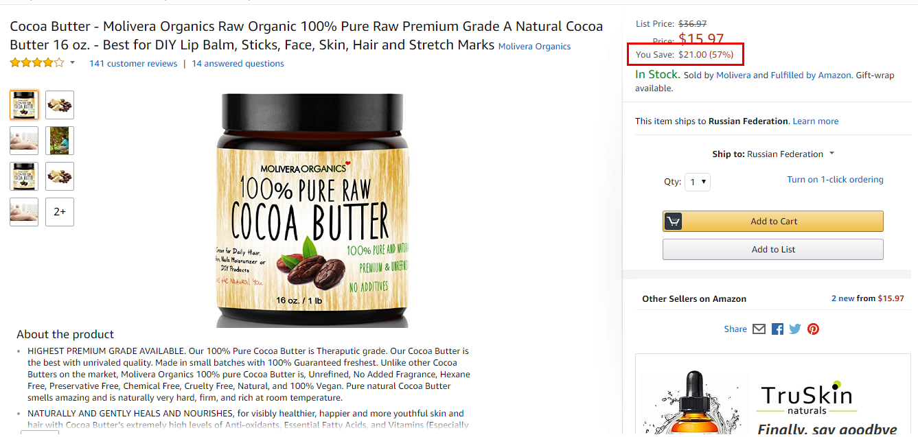 Чтобы показать покупателю, сколько он может сэкономить, в карточке товара на amazon.com указывается не только старая и новая цена, но и разница в денежном выражении. Наивысшая стоимость обозначается для так называемого якорения покупателя — мозг человека устроен таким образом, что любая информация сравнивается с уже имеющейся. Фраза «Вы экономите» закрепляет эффект и убеждает покупателя в выгоде покупки.