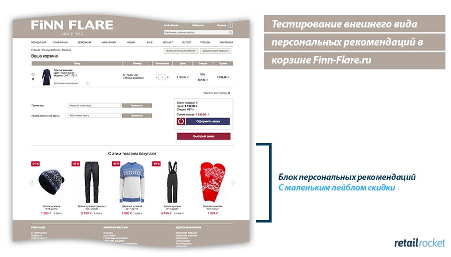 На те же триггеры воздействует указание процента скидки на товар. Причем, информация о скидках и распродажах эффективно работает не только в карточке товара, но и на других страницах сайта. Например, использование лейбла скидки в блоке рекомендаций в корзине интернет-магазина FiNN FLARE увеличило конверсию на 0,63%, а средний чек на 2,5%, что обеспечило прогнозируемый рост выручки на 3,16%.