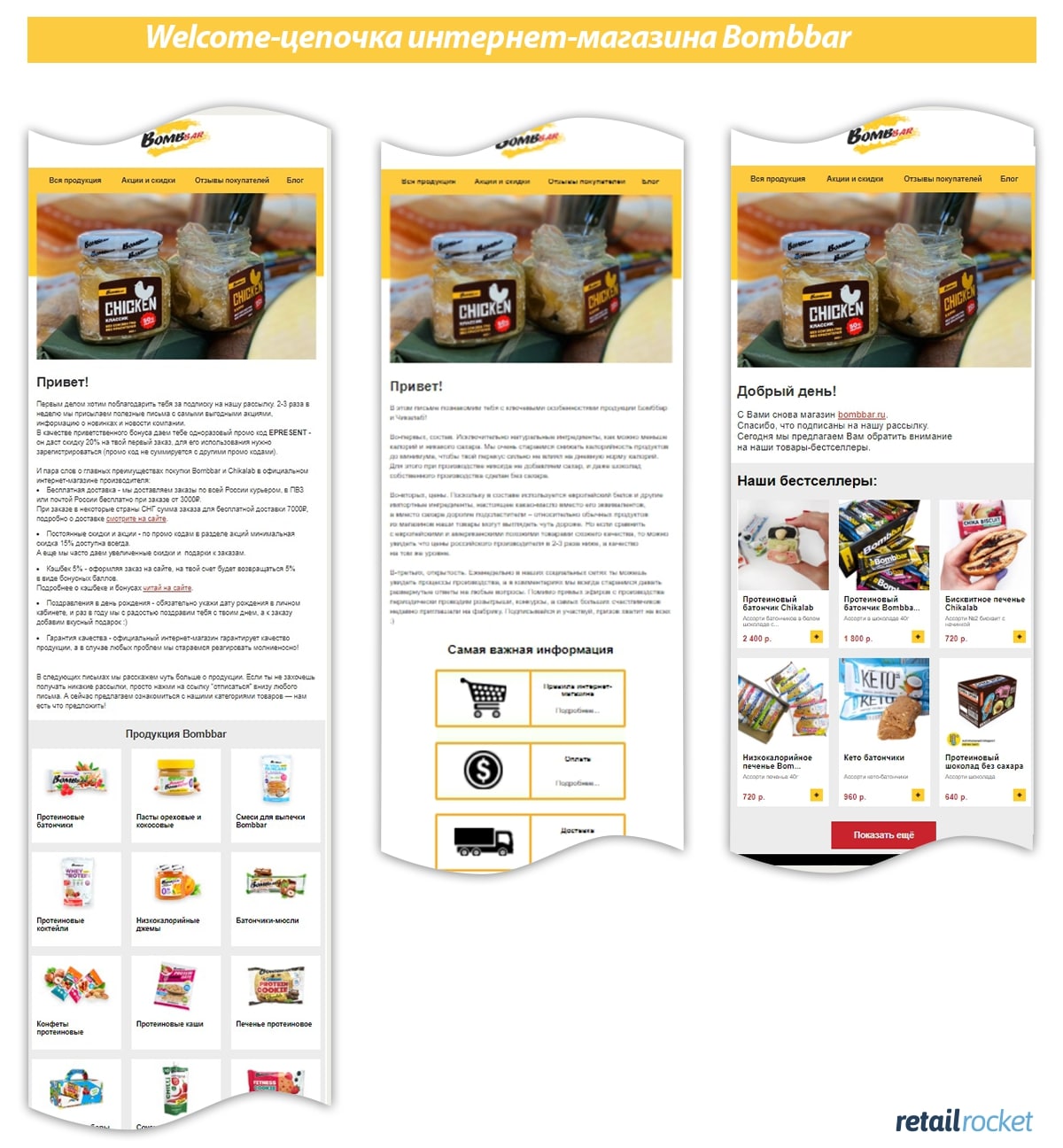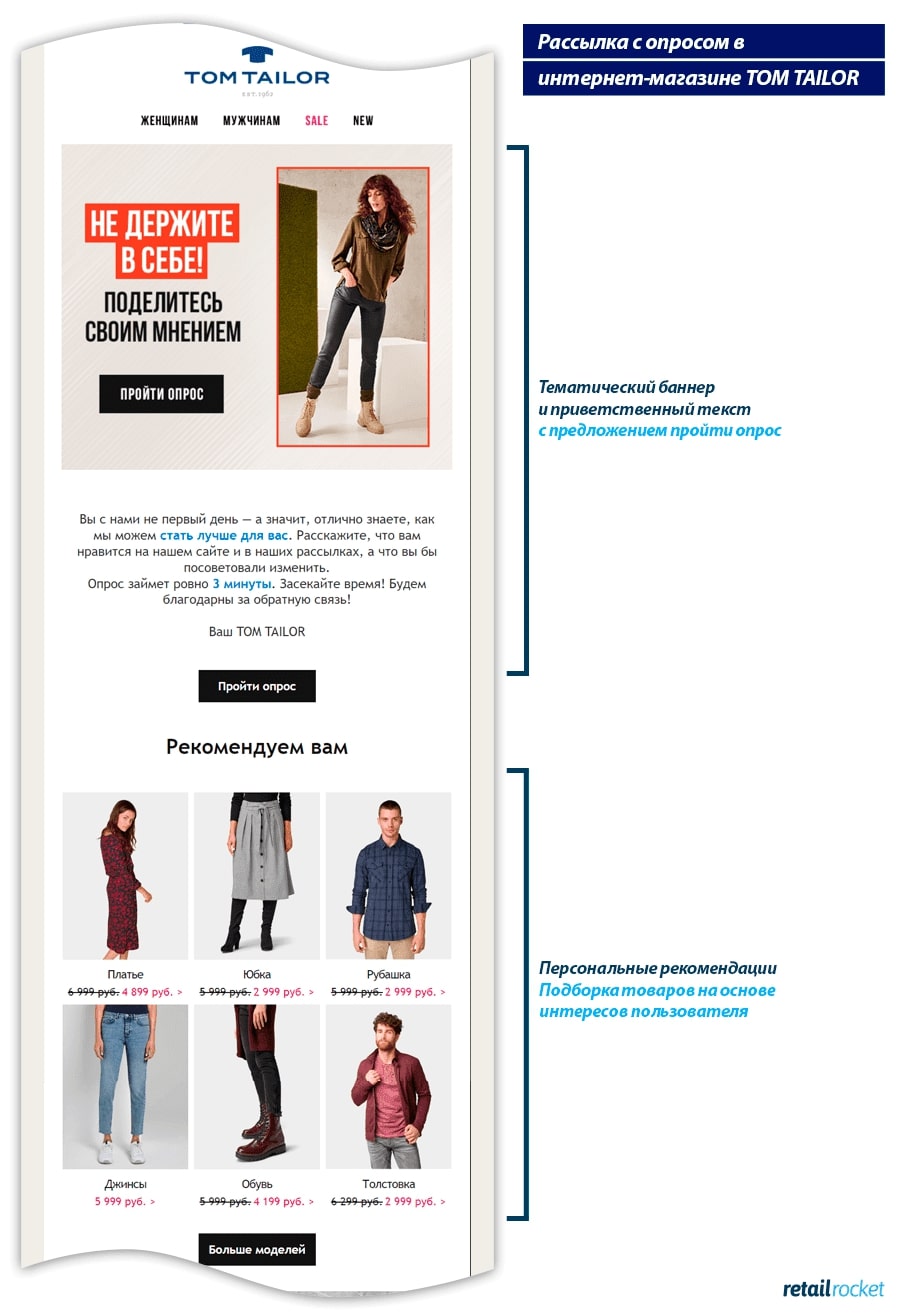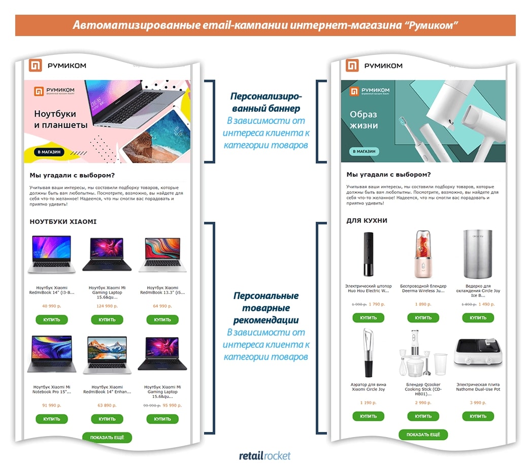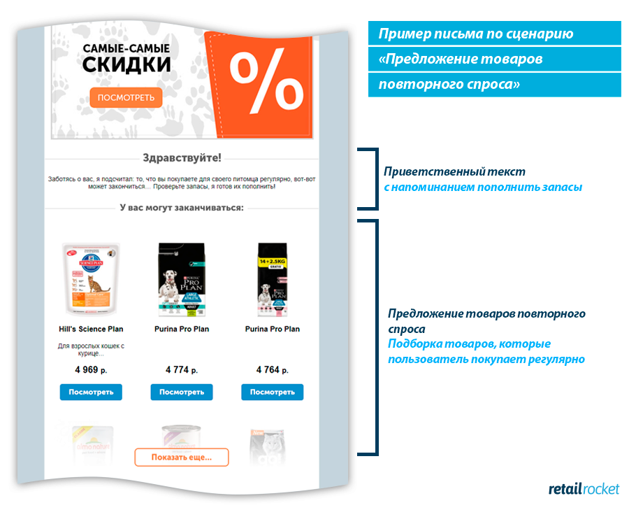Аналогичным образом можно практически бесконечно допродавать товары регулярного спроса, через email-маркетинг. Например, триггерный сценарий «предложение товаров повторного спроса» от платформы Retail Rocket позволяет автоматически анализировать срок потребления товара покупателем, и когда имеющийся запас подходит к концу, система отправляет пользователю e-mail с актуальным предложением нужного товара. Средняя конверсия этого триггера в заказы составляет 28,83%.