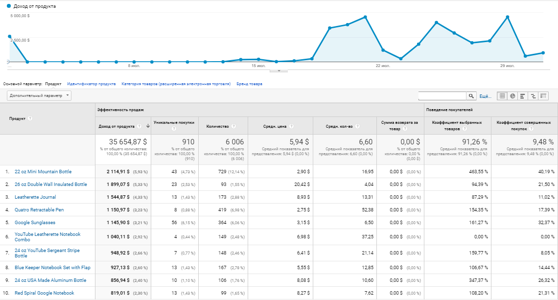 С помощью отчета Product Performance Report можно анализировать показатели конверсии разных товарных позиций, сравнивать товары по объему заказов, общей выручке от их продажи, количеству их добавлений или удалений из корзины, числу просмотров карточки товара и т.д.