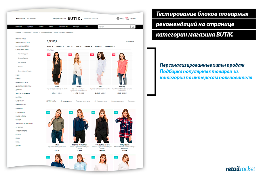 Один из способов увеличить эффективность страницы категории и карточки товара интернет-магазина — использовать персональные рекомендации. Например, применение механики «Персонализированные хиты продаж из категории» в блоке рекомендаций на странице категории сайта интернет-магазина BUTIK. привело к росту конверсии на 6,92%, и росту выручки на 6,35%.