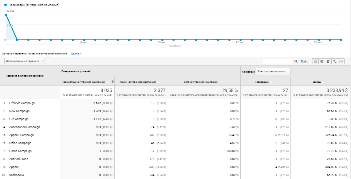 Благодаря отчету Internal Promotion Report можно получить точные данные об эффективности баннеров и промо акций внутри интернет-магазина без создания отдельных событий для каждой кампании.