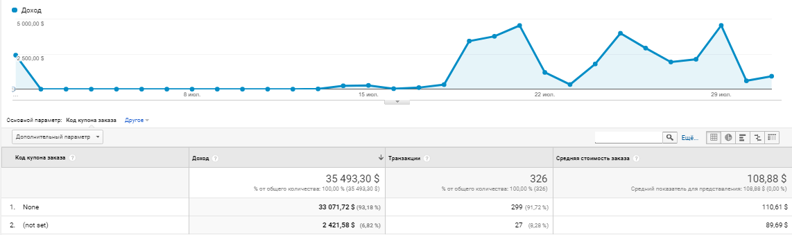 Отчет Coupon Code Performance Report позволяет отслеживать эффективность скидочных купонов и промокодов интернет-магазина. Можно сравнивать купоны по объему выручки, среднему чеку и количеству покупок по ним, что позволит оптимизировать стратегию предоставления скидок вашим интернет-магазином.