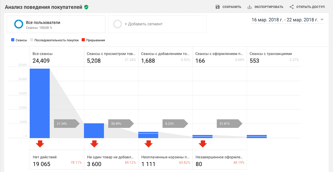 В отчете отражаются разные этапы поведения клиента на сайте за выбранный период времени, диаграмма отказов от покупки (или «брошенных корзин»), а также таблица со статистикой поведения посетителей, которые зашли на сайт, но не завершили оформление заказа.