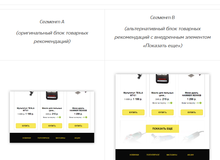 Пользователи по разным причинам будут продолжать оставлять покупки незавершенными. Хорошая новость состоит в том, что покупателя можно вернуть к завершению заказа. Для этого большинство магазинов используют триггерные письма о брошенной корзине. Но важно не просто отправлять пользователям email с приглашением вернуться к покупкам, но и постоянно экспериментировать с дизайном и различными элементами. Например, добавление элемента «Показать ещё» после блока товарных рекомендаций в email-рассылку по сценарию «Брошенная корзина» принесло интернет-магазину 220-volt.ru увеличение CTR на 9,35%.