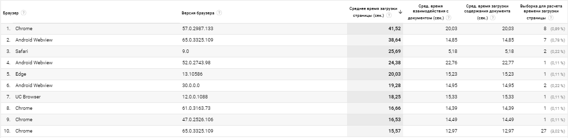 Отчет Site Speed Metrics by Browser & Browser Version позволяет определить показатели скорости работы интернет-магазина для разных браузеров и выявить возможные проблемы с конкретными версиями веб-обозревателей.