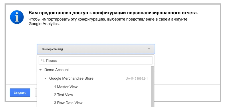 Чтобы импортировать отчет, выберите в представлении свой сайт или добавьте отчет к демо-аккаунту Google.
