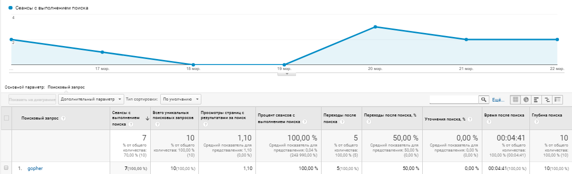 Отчет Site Search Report отображает статистику поисковых запросов пользователей на сайте. Это сформированный спрос — покупатель, который выбирает конкретный товар, гораздо более склонен к совершению покупки, чем пользователь, который просто просматривает страницы сайта.