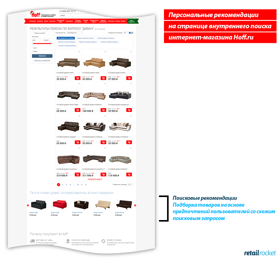 Один из наиболее эффективных алгоритмов рекомендаций — поисковые рекомендации, которые могут быть использованы в качестве дополнения к результатам поиска по сайту.