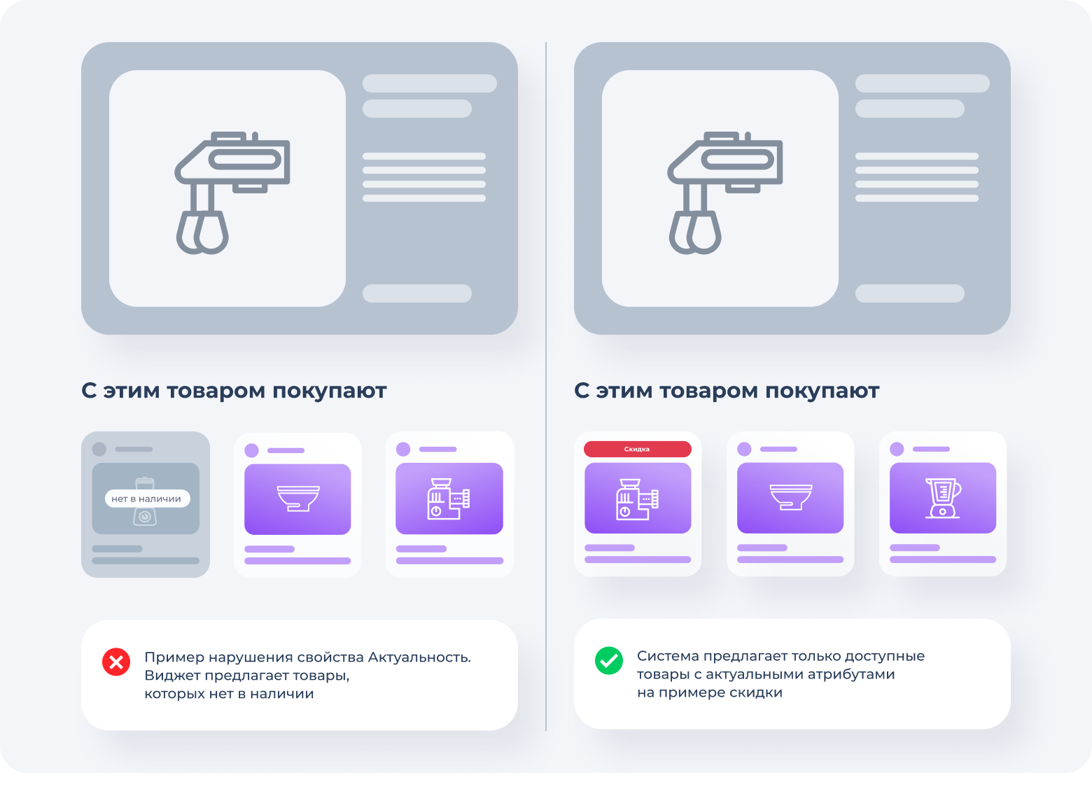Для покупателей, наличие в рекомендациях товаров, которые они не могут купить, приводит к нарушению ожиданий от данного инструмента. Это может привести к потере доверия как к рекомендациям, так и к любому другому инструменту магазина. Показ неактуальных товаров приводит к похожему эффекту.