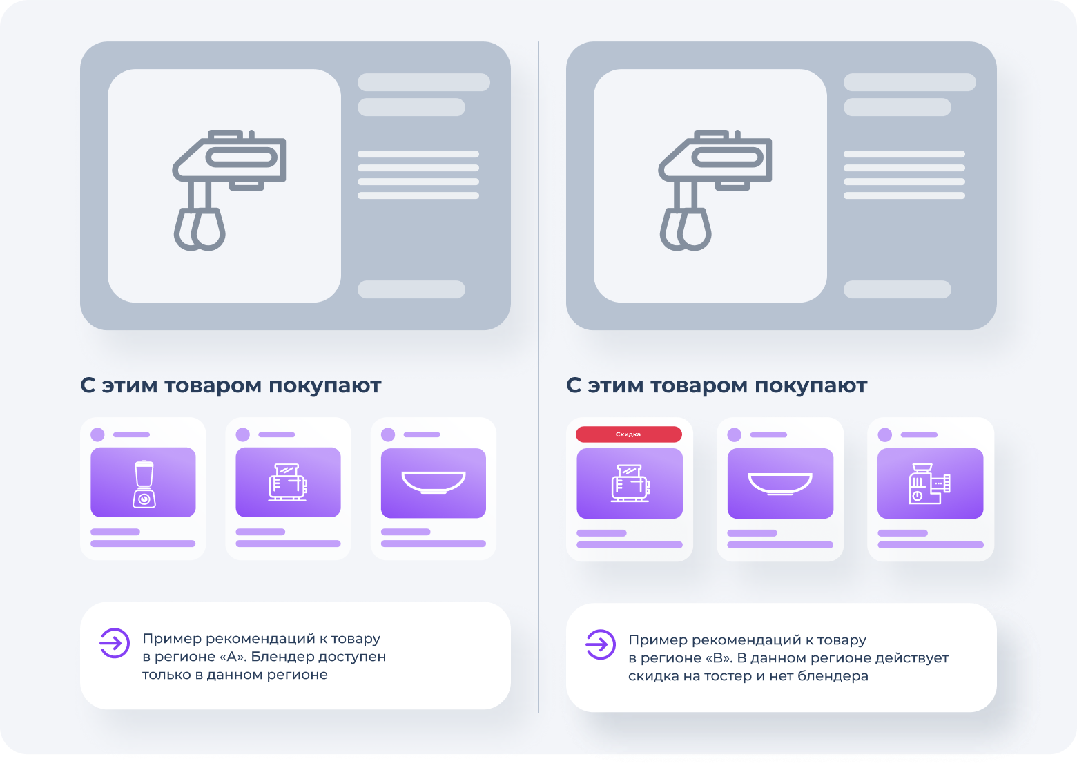 Доступность, цена и другие атрибуты товаров интернет-магазина могут отличаться в зависимости от региона, склада и торговой точки. Существуют магазины с тысячами складов, атрибуты товаров в которых отличаются. Для каждого склада могут быть свои рекомендации за счёт различного поведения покупателей и различных атрибутов товаров, в первую очередь доступности. Системе рекомендаций необходимо правильно учитывать эти атрибуты в зависимости от региона покупателя.