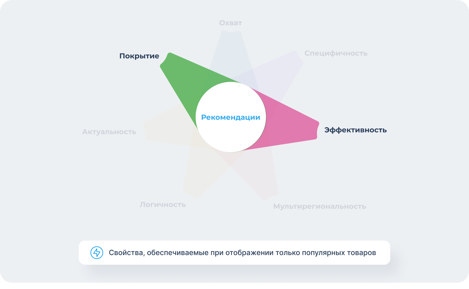 Если часто показывать в рекомендациях одни и те же товары, пусть даже они популярны и их покупают повсеместно, то можно добиться полного покрытия. Для продуктов питания такими товарами могут быть бананы, яйца, вода, овощи. В детских товарах — подгузники и детское питание. Для некоторых алгоритмов показ такой небольшой группы универсальных товаров позволяет добиться высокой эффективности. При этом не обеспечиваются свойства специфичность и охват.