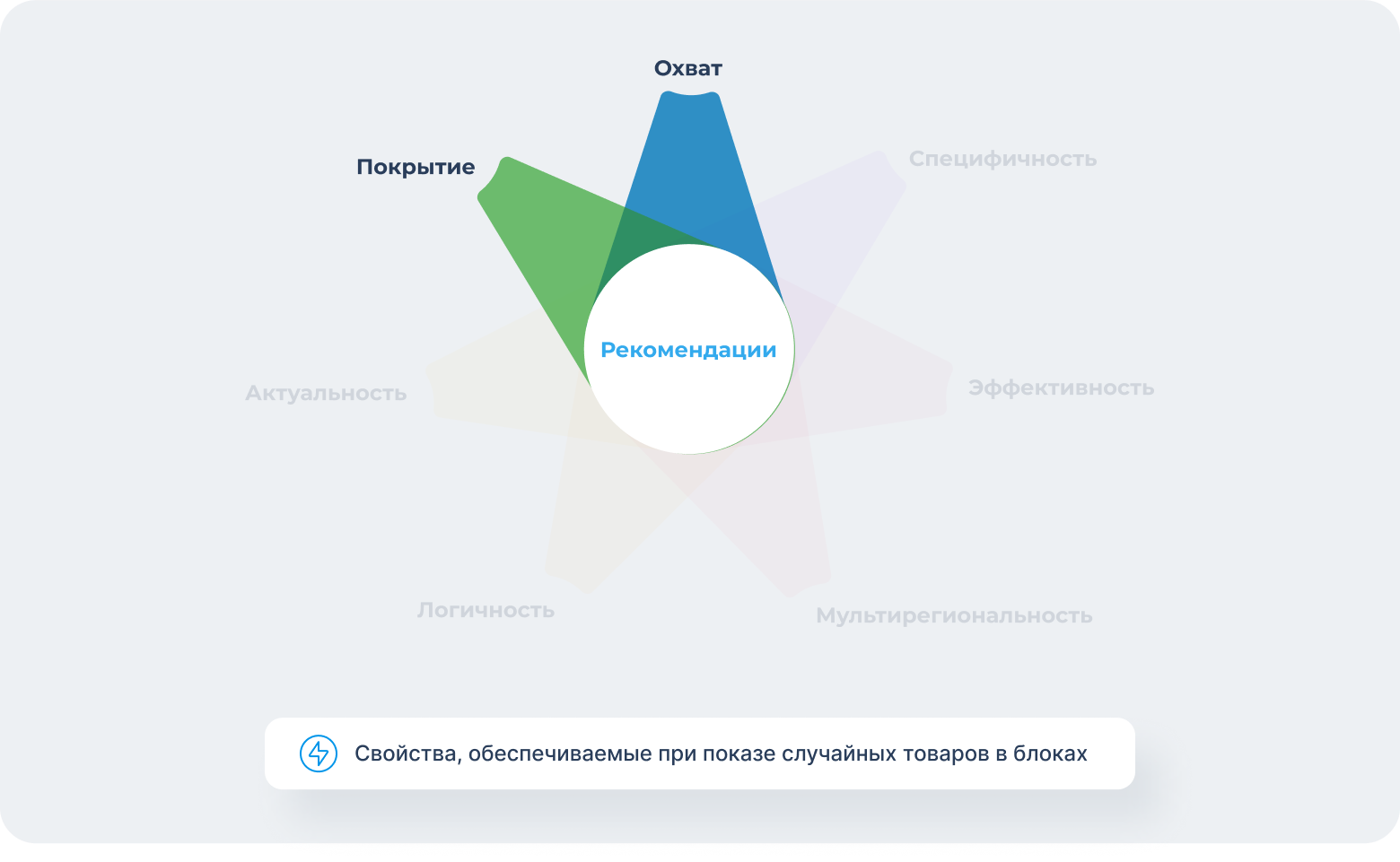 Но для выполнения свойства покрытия необходимо показывать рекомендации к новым и не очень популярным товарам, для которых нет достаточной статистики. Для выполнения свойства охвата необходимо показывать в рекомендациях не только популярные товары. Поэтому приходится искать более сложные решения. С другой стороны, можно решить проблему покрытия и охвата, показывая случайные товары. Но тогда рекомендации теряют свойства логичности, эффективности и специфичности.