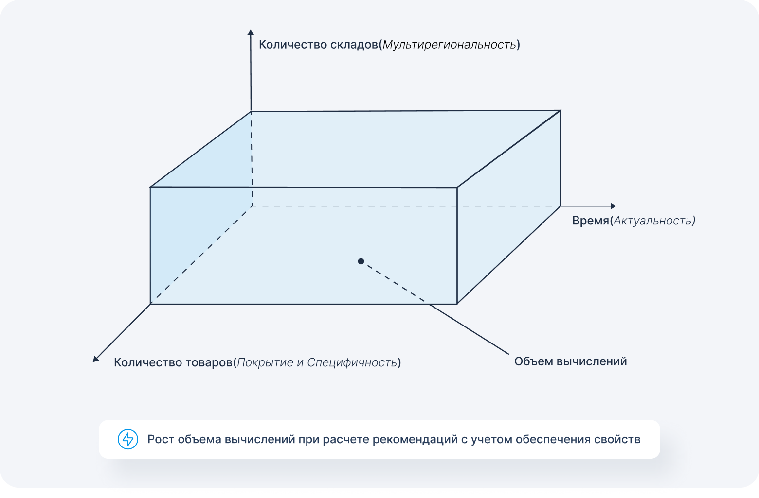 Совместная работа таких свойств как мультирегиональность, покрытие и специфичность тоже сложная задача. Существуют магазины с множеством складов, где для каждого склада необходимо предоставить подходящие рекомендации к каждому товару с учетом атрибутов товара для соответствующего склада. Число различных вариантов рекомендаций в таком случае достигает произведения количества складов на количество товаров магазина. Это требует больших вложений в работу с данными, эффективность алгоритмов и инфраструктуры. К дальнейшему усложнению приводит необходимость выполнения свойства актуальности. Товарная база очень часто меняется и необходимо постоянно рассчитывать и обновлять рекомендации. Для выполнения свойства специфичности для персональных рекомендаций необходимо их обновлять в реальном времени, поскольку контекст текущего пользователя меняется при каждом действии.