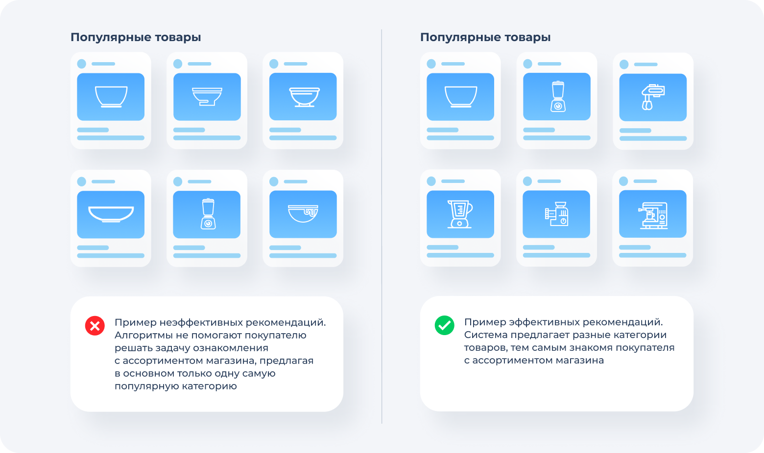 По внешнему виду рекомендаций можно понять их эффективность при решении задач покупателя. Например, однообразная товарная выдача не решает задачу знакомства с ассортиментом магазина. А если из рекомендаций удалены все ранее купленные товары, то алгоритмы не решают задачи покупателя по отношению к товарам регулярного спроса: при покупке корма для животных рекомендации не напомнят о наполнителе для туалета, а при покупке рыбы не предложат ранее купленные подходящие специи.