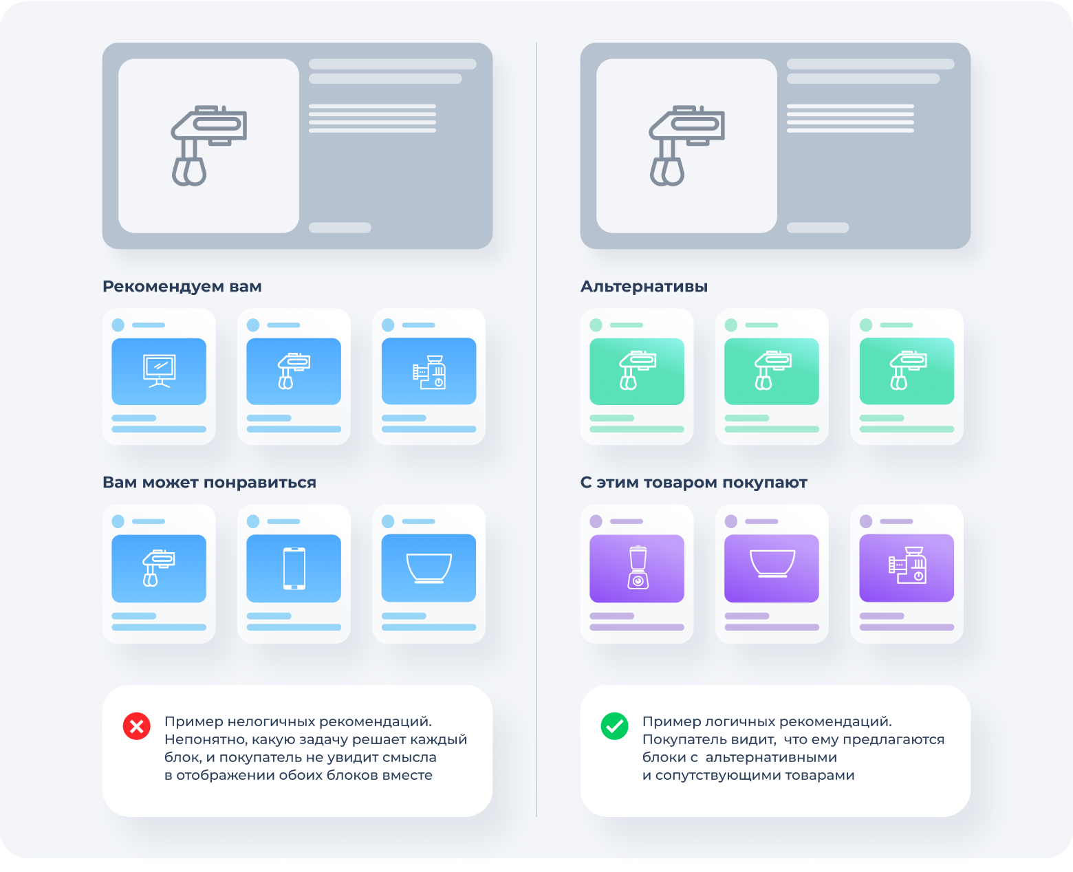 Покупатель должен понимать, почему виджет с рекомендациями на сайте предлагает конкретные товары. Если рекомендации помогают найти дополняющие заказ товары, то в них должны быть не альтернативные, не популярные в магазине, а именно дополняющие заказ товары.