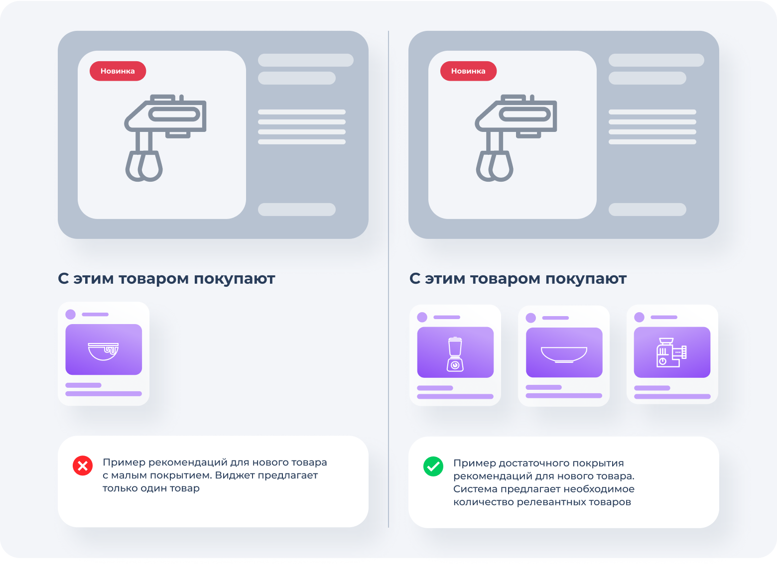 3. Охватывайте весь ассортимент. Рекомендации должны работать для всех товаров, включая новинки и менее популярные позиции. Если для интересующего товара система не предлагает ничего — это раздражает клиента и снижает его лояльность.