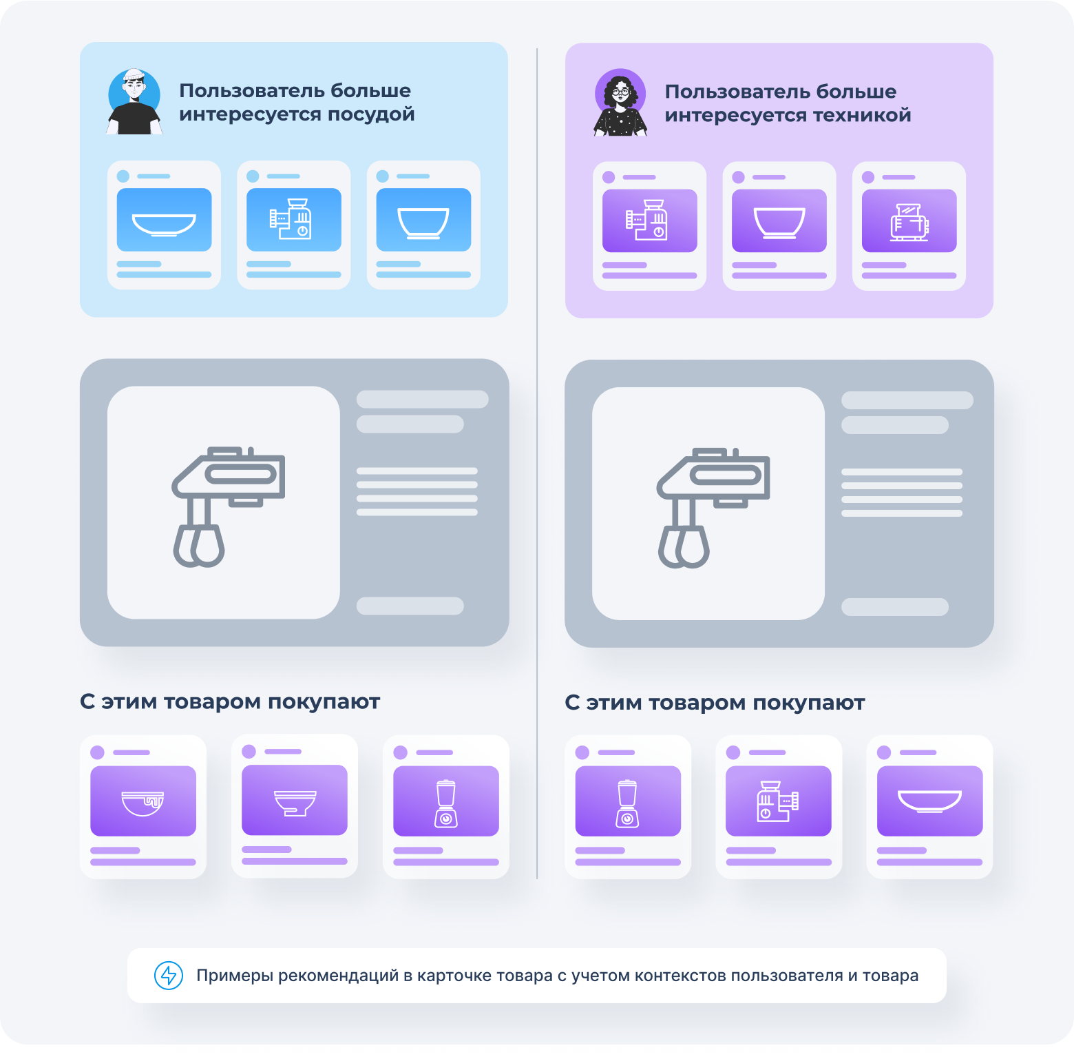Система должна предлагать разные рекомендации в зависимости от текущего контекста. Контекстом может быть тип страницы, товар, на странице которого размещены рекомендации, или пользователь, которому они показываются.