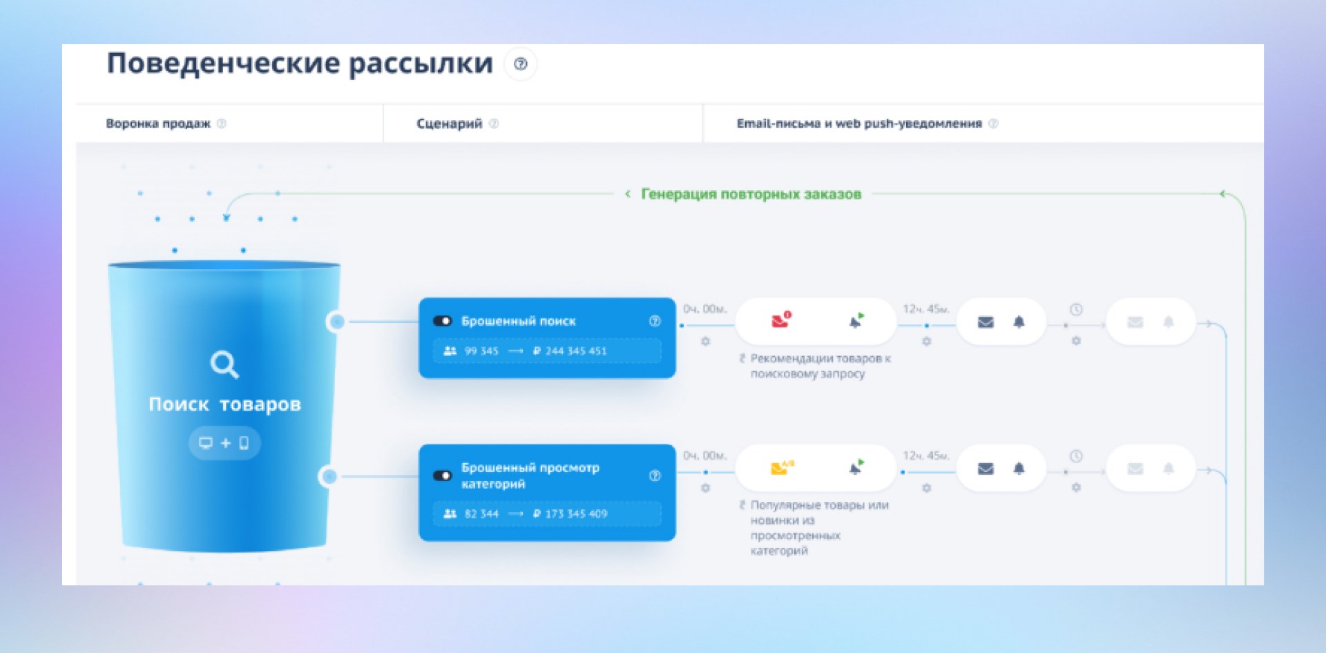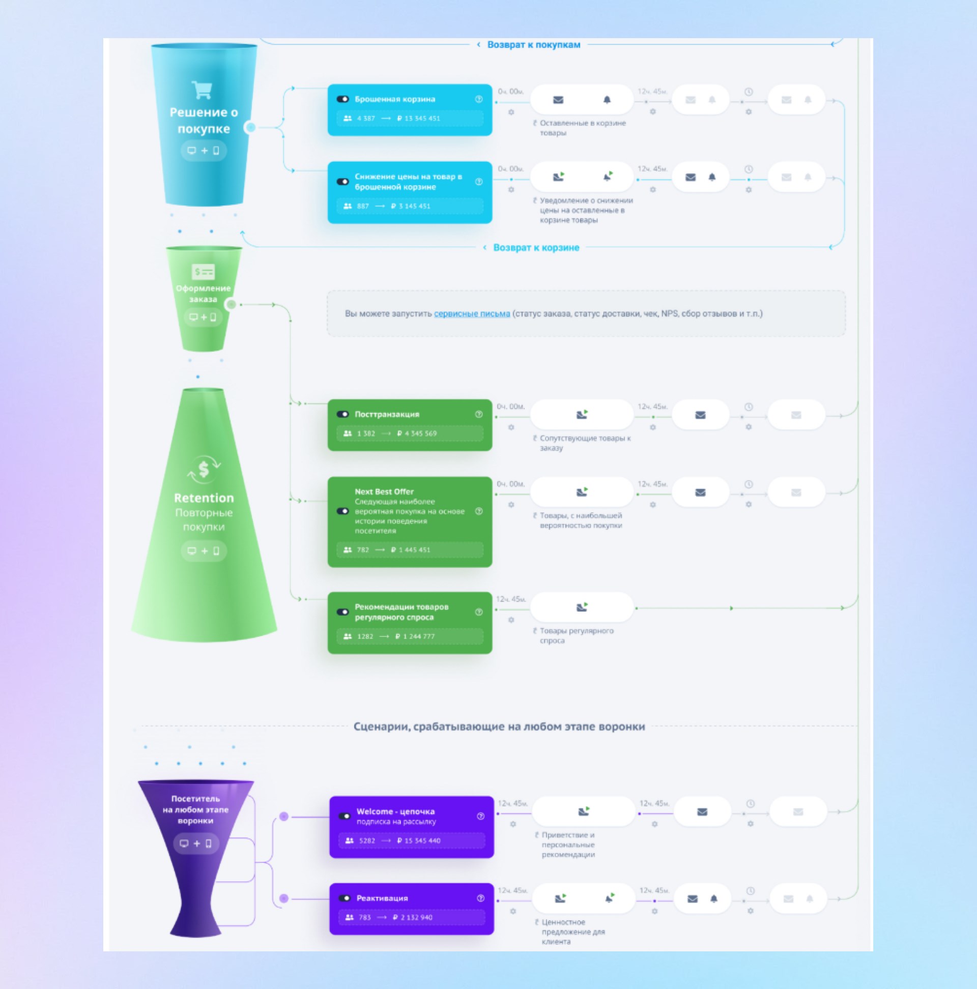 Инструменты Retail Rocket Group помогают составить карту автоматических триггерных рассылок — это серия поведенческих сценариев, которые срабатывают в реальном времени, в зависимости от того, как пользователь движется по воронке продаж.