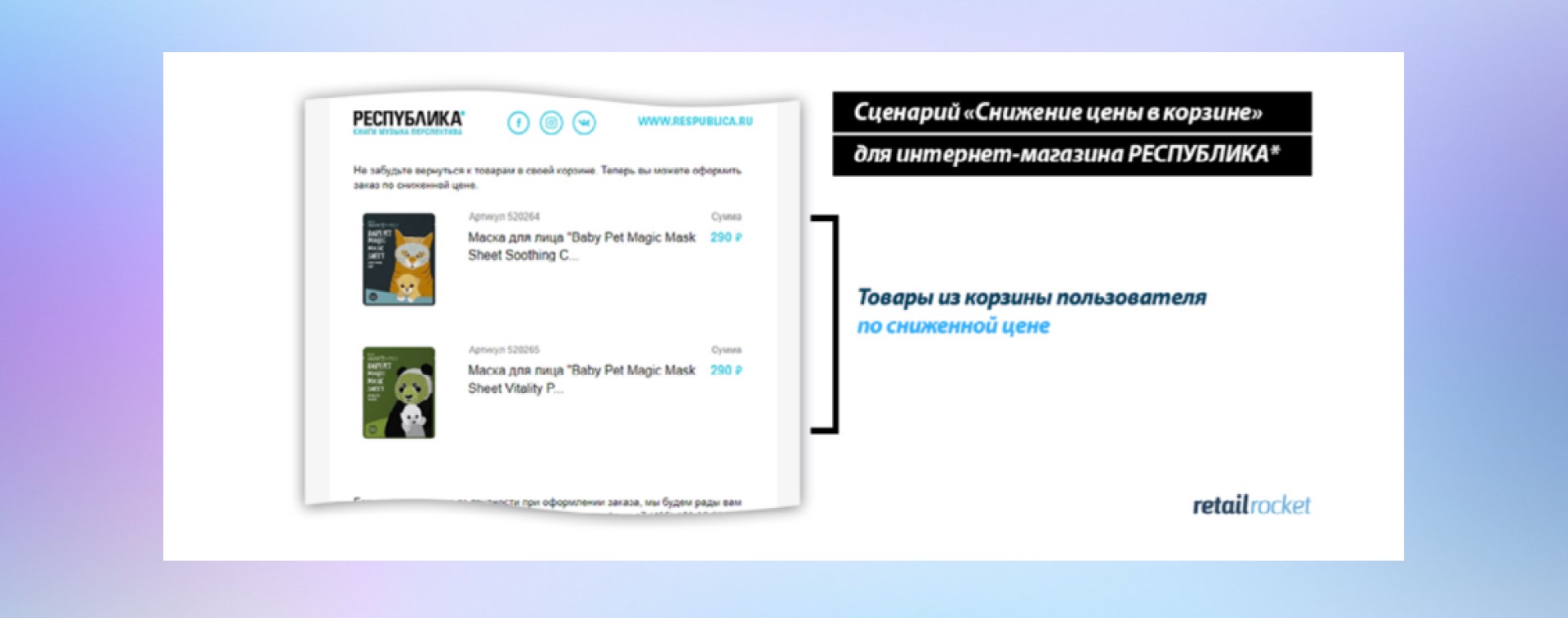 Согласно исследованию аналитиков Retail Rocket, в сегменте fashion за неделю у около 10% товаров, добавленных в корзину пользователями, снижается цена на 5% и более. Платформа Retail Rocket Group автоматически отслеживает изменения цен на все товары, которые пользователь добавил в корзину или просмотрел, и отправляет уведомление по электронной почте, если цена хотя бы на один товар падает.