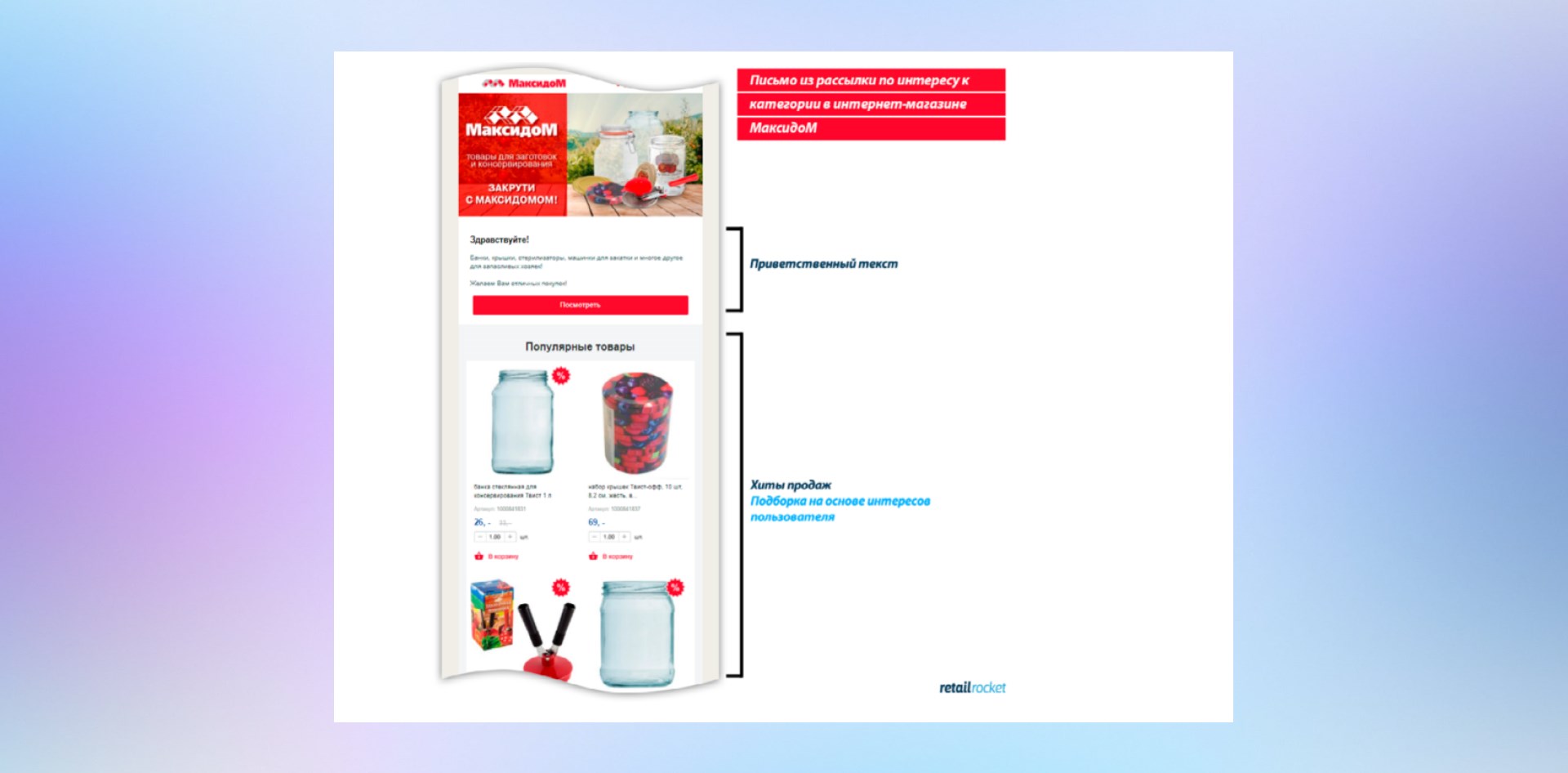 Эксперты Retail Rocket Group разделили клиентскую аудиторию в зависимости от интересов к определённым категориям и настроили автоматические рассылки с учётом сезонных факторов. К примеру, если клиент проявляет интерес к спортивным товарам, с наступлением сезона активного отдыха можно предложить ему всё необходимое для занятий спортом на улице: снаряжение, одежду, аксессуары и другие товары. Таким образом, вероятность отклика получателя на такие предложения существенно возрастает.