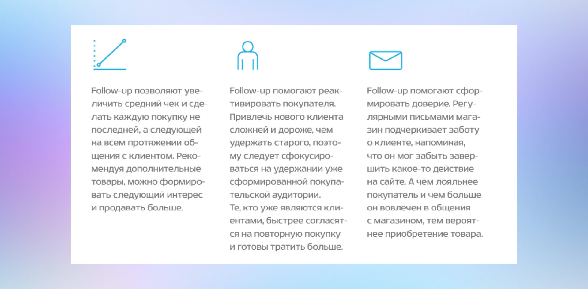 Пример Фоллоу-апа: если клиент совершил покупку в магазине, чтобы мотивировать его к следующим покупкам, можно попросить оставить отзыв, порекомендовать сопутствующие или похожие товары, рассказать о бонусной программе, предложить скидку на следующий заказ.