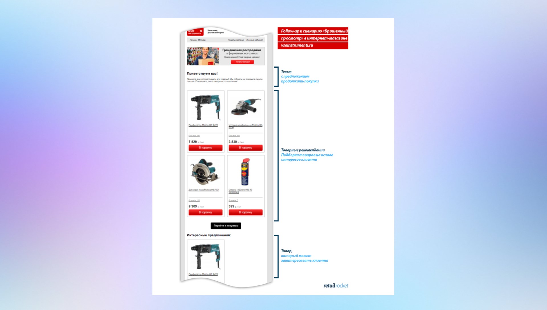 Сценарий «Брошенный просмотр» был усилен Follow-up письмами: если покупатель просматривал карточки товара, но не переходил на следующий этап Customer Journey, он получал первое автоматическое письмо с благодарностью за посещение сайта и персональными рекомендациями: