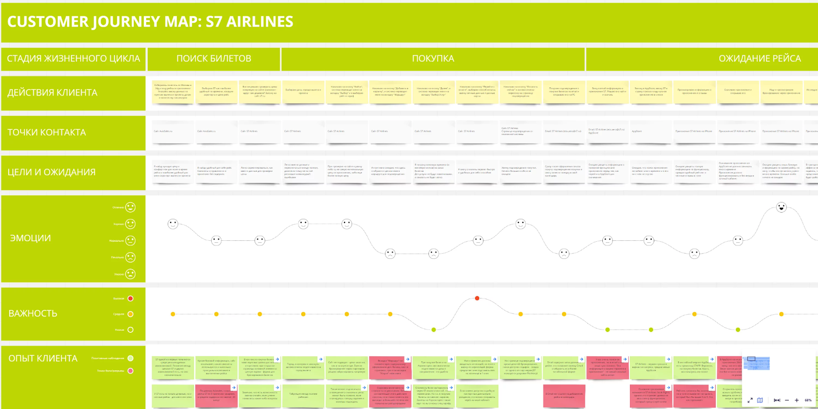 Для визуализации CJM в командах с несколькими отделами часто используют Miro. Этот инструмент даёт возможность создать доску с этапами, точками касания и эмоциями, к которой можно дать доступ всем участникам проекта. На одном экране видно всю карту, а изменения можно вносить в режиме реального времени. Например, команда продукта может обозначить узкие места в интерфейсе, маркетинг — слабые зоны в коммуникации, а служба поддержки — частые жалобы пользователей.