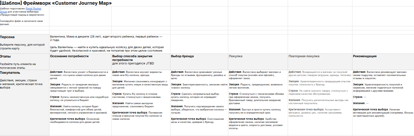 Для упрощения процесса можно использовать готовый шаблон в Google Sheets. Мы разработали его для вебинара, но он актуален и сейчас: структура адаптирована под B2C и B2B, включает поля для целей, болей, эмоций и ответов бизнеса. Подходит для командной работы: можно делиться, комментировать, обновлять онлайн.