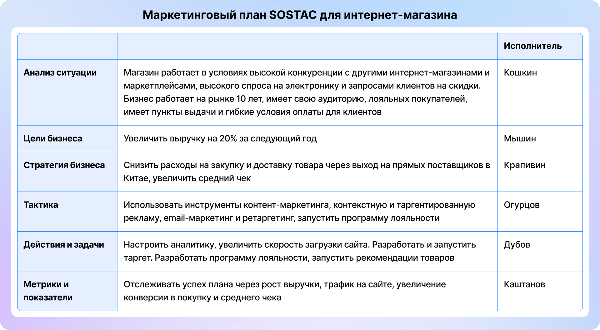 SOSTAC — универсальная формула маркетингового плана, которой редко придерживаются. Например, в одной компании могут строго следовать плану, а в другой ограничиться первыми четырьмя шагами и остановиться на тактике.