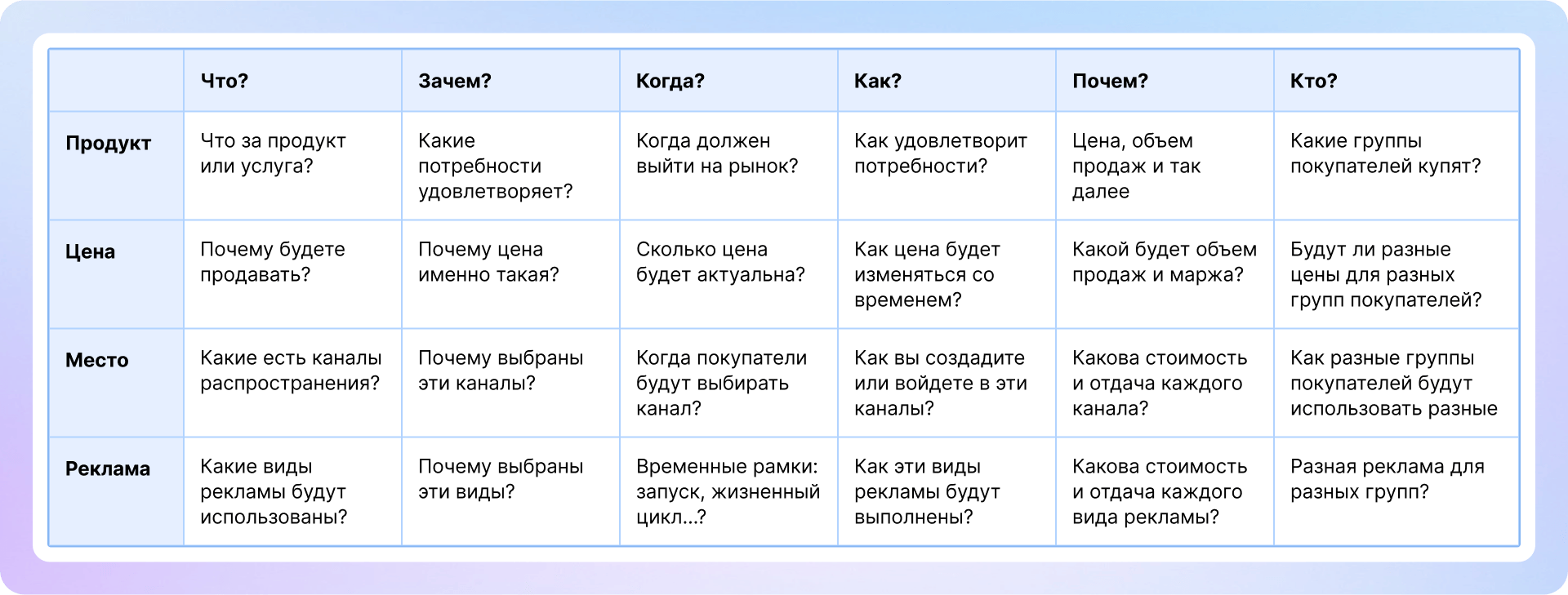 Маркетинговый план по шаблону Келли Одела предлагает описать четыре элемента, которые влияют на продажи бизнеса:
