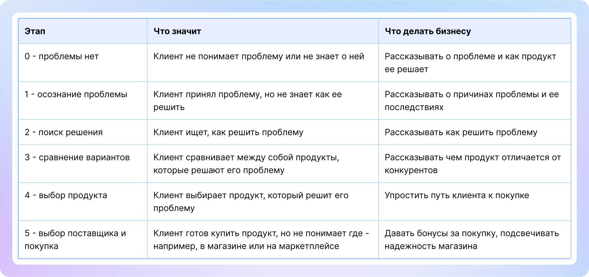 Маркетинговый план по модели Ханта делит пользователей на пять групп — так, как клиенты относятся к бизнесу. А еще помогает понять, как взаимодействовать с пользователем на каждом из шагов, который ведет к покупке.