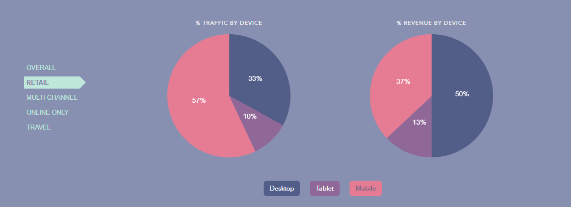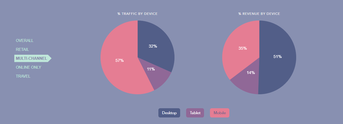 В 2017 году на покупки с компьютера приходился 61%, а заказы с мобильных составляли 26%, при распределении трафика 36% и 52% соответственно: