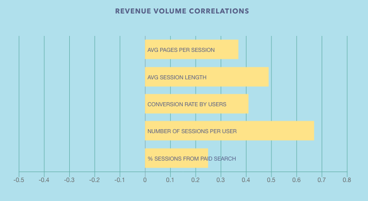 С конверсией сильнее всего коррелируют доля прямых заходов, время загрузки на мобильном и доля мобильных посетителей. Лояльные пользователи, которые заходят на сайт напрямую, конвертируются лучше всего, что совершенно неудивительно. Но важно отметить, что роль мобильных устройств, как мы и писали выше, неумолимо растет — два из трех факторов связаны именно со смартфонами. Учитывайте это в формировании стратегии развития и коммуникации.