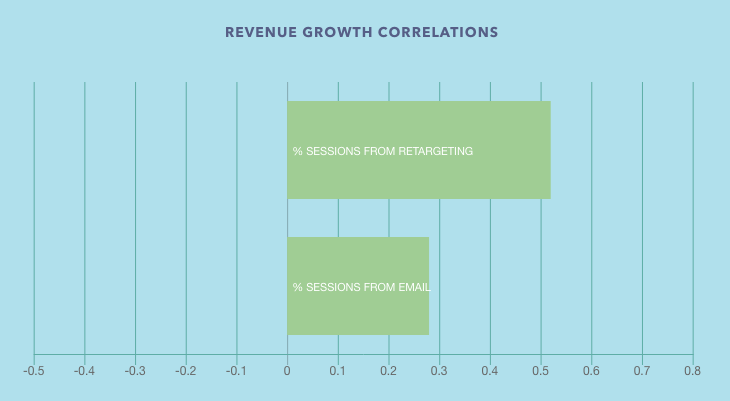 А вот на рост выручки больше всего влияет процент сессий из ретаргетинга и email-канала. Пора обратить внимание именно на эти каналы, если вам важно увеличивать рост дохода магазина.