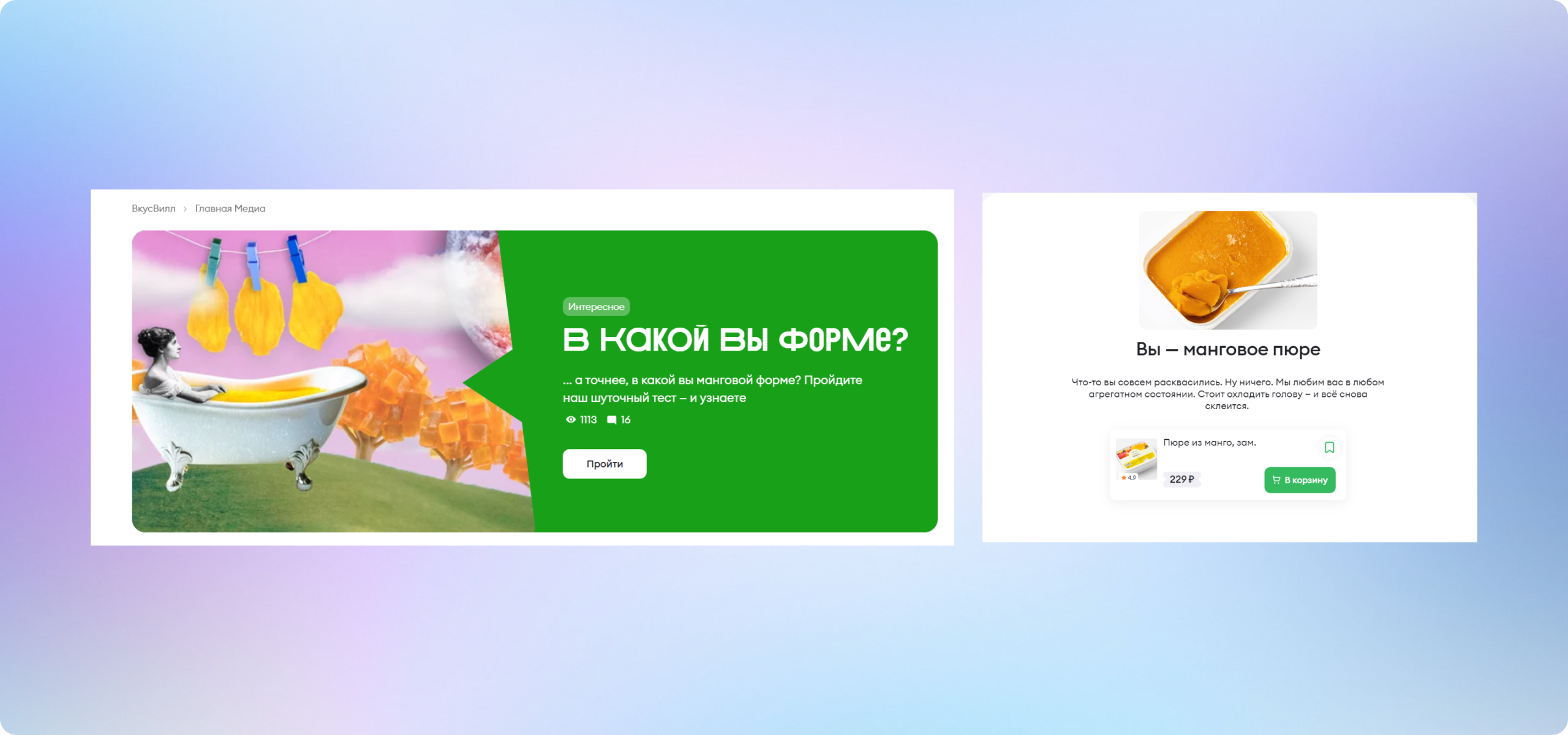 А сеть магазинов «ВкусВилл» с помощью шуточного теста подчёркивает тёплое отношение к клиентам, укрепляя лояльность, и ненавязчиво рекомендует товары из каталога: