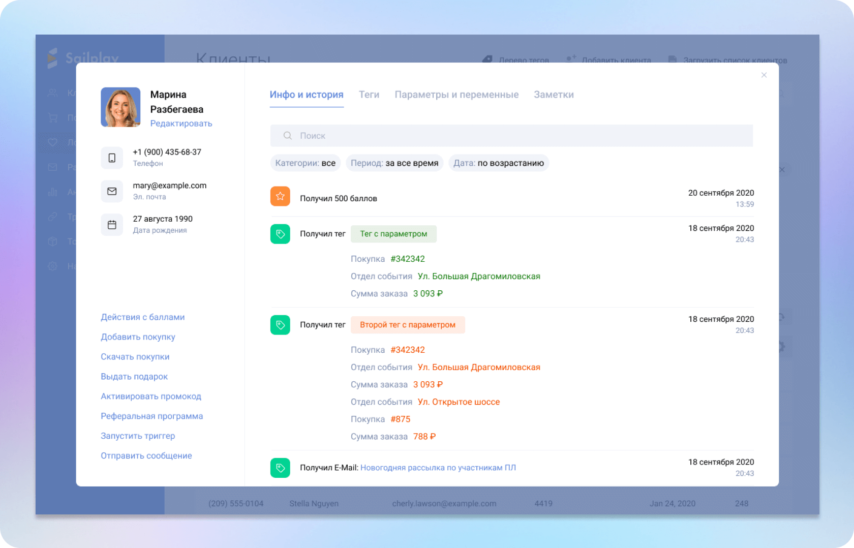 Так выглядит карточка клиента CDP от Retail Rocket Group — платформы, которая помогает агрегировать онлайн и офлайн данные о клиентах, сегментировать контакты со скоростью 1 млн контактов в секунду и автоматизировать маркетинг