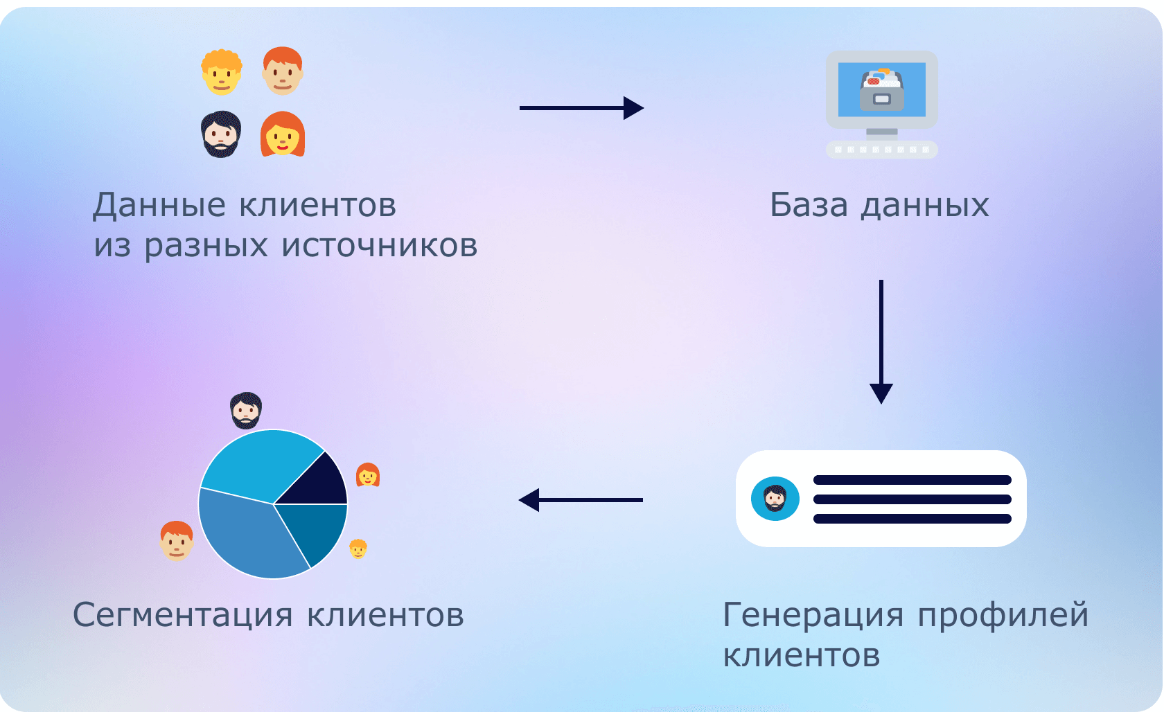 CDP постоянно собирает данные о клиентах из разных источников, накапливает и обрабатывает информацию, и выдает готовые результаты в виде профилей клиентов и сегментам по разным категориям