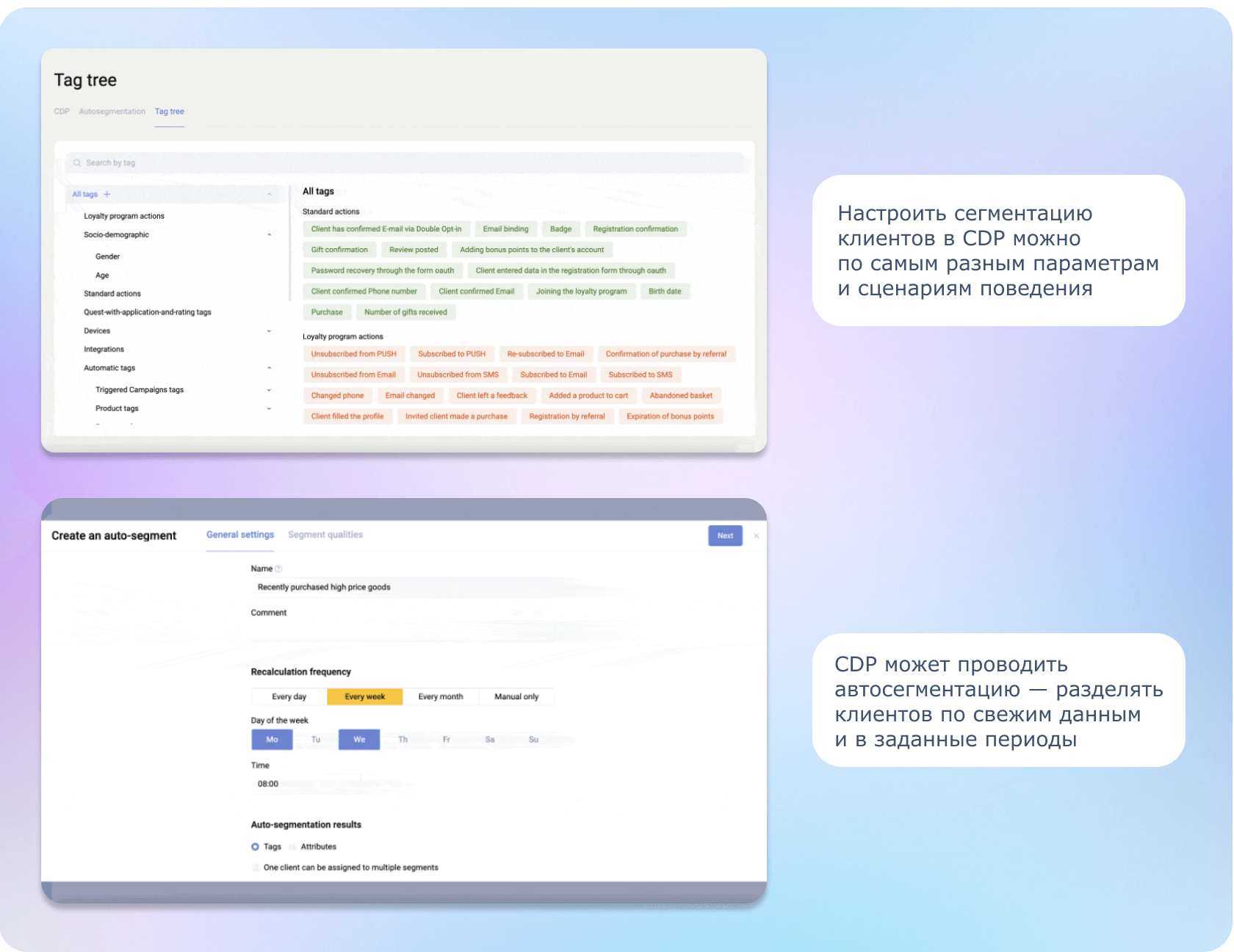 Один из сценариев донастройки CDP — бизнес может настроить автоматическое обогащение данными и сегментацию по необходимым параметрам. Например, выделять клиентов, которые недавно купили самые дорогие товары