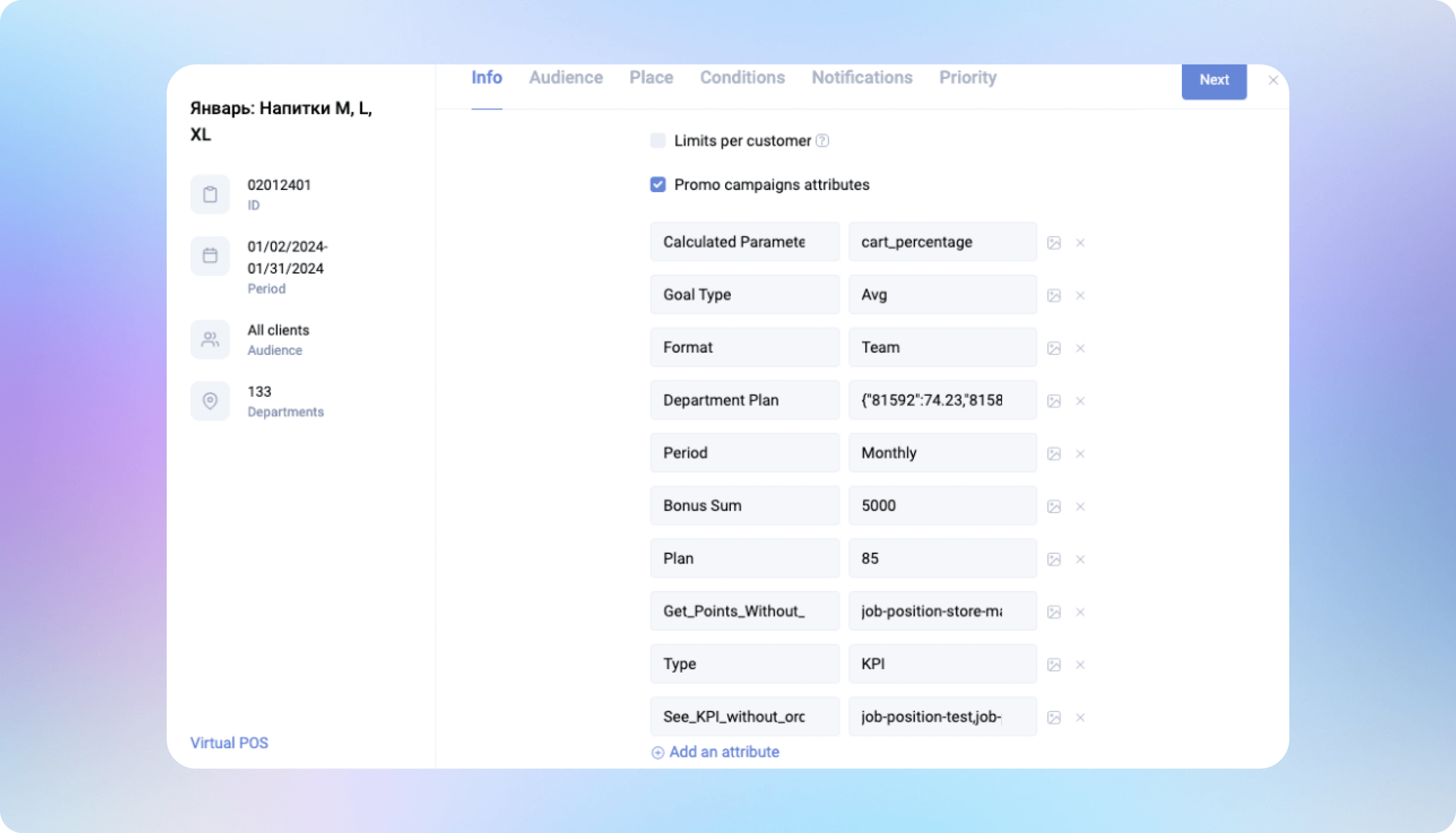 С помощью атрибутов механики «Акции» менеджеры Cofix выбирают KPI, а также локации, конкретных сотрудников и количество баллов для вознаграждения. Когда акция запускается, она начинает автоматически отслеживать покупки. Вся система работает в режиме self-service.