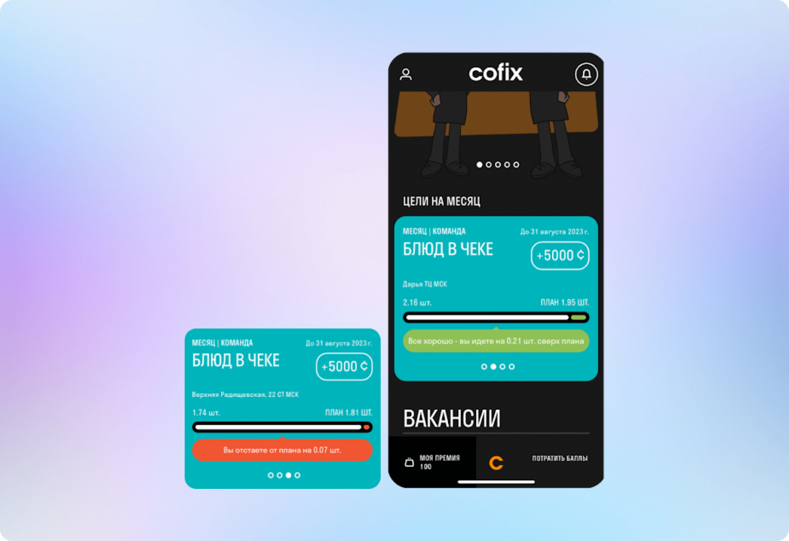 Пример Cofix показывает, как можно адаптировать такую программу без больших вложений. Компания использует платформу лояльности для клиентов, чтобы мотивировать своих бариста. Внутри приложения для сотрудников Cofix Connect, каждый может отслеживать свои KPI: сколько товаров продано, какой средний чек, и как выполняются личные и командные цели.