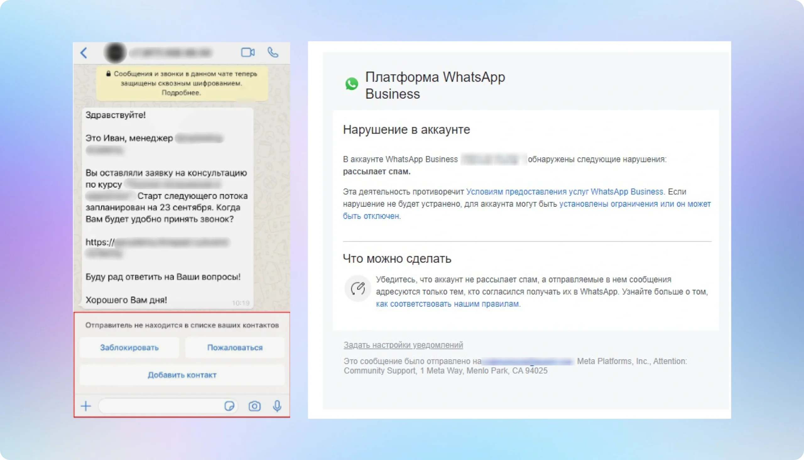 Если пользователь выбирает «Пожаловаться», то последние пять сообщений компании отправляются на проверку в WhatsApp. Если пользователь выбирает «Заблокировать», то рассылка перестаёт ему доставляться. Когда таких пользователей становится много, Meta* занижает статус компании и впоследствии блокирует её номер.