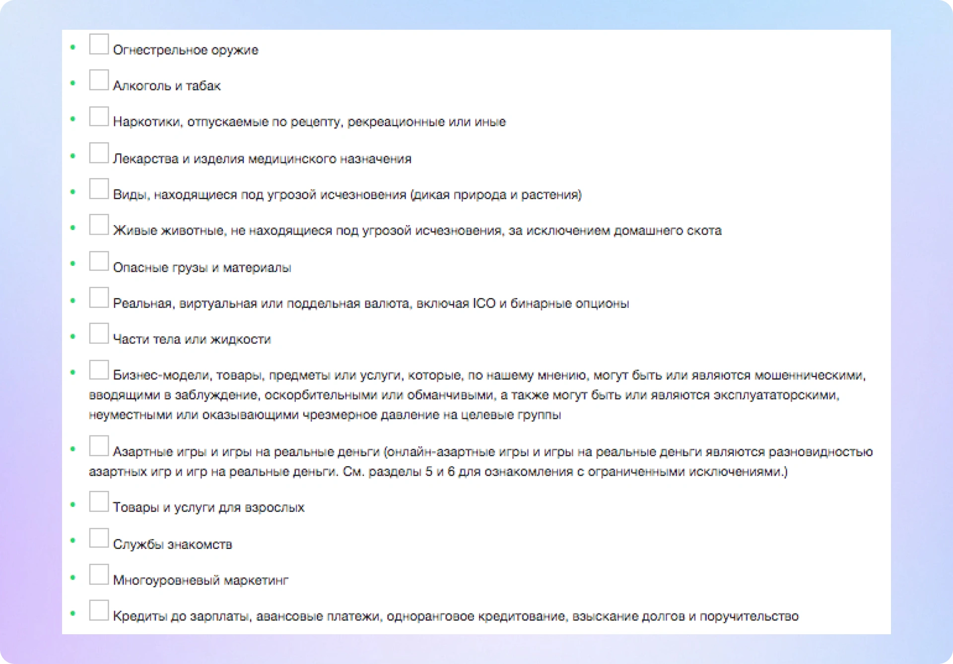 Бизнес-сервисы WhatsApp запрещают использовать свою платформу в преступных целях. Нельзя рассылать спам, публиковать фальшивые новости и контент 18+. Также нельзя продавать, покупать, продавать следующие товары и услуги: