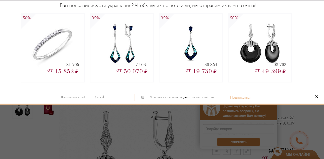 Варианты «окон захвата» могут быть разными: от классического pop-up до выезжающей из верхнего меню панели (exit intent bar), как у интернет-магазина Московского Ювелирного Завода, которая появляется при попытке пользователя покинуть сайт: