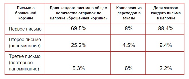 Подобные цепочки писем позволяют поднять эффективность «брошенной корзины» примерно на 20-25% по сравнению с отправкой единичного напоминания.
