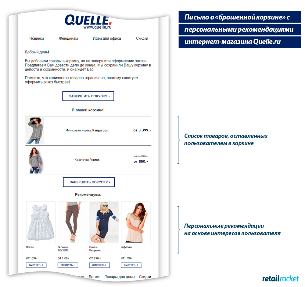 Чем дольше пользователь думает, тем меньше вероятность, что он решит завершить покупку, поэтому медлить с отправкой напоминания об оставленных в корзине товарах не стоит.