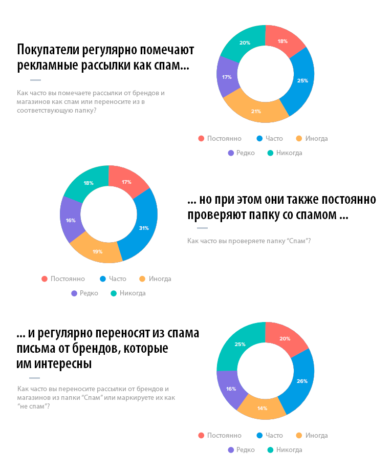 Более половины пользователей время от времени помечают маркетинговые рассылки как спам. С другой стороны, примерно такое же количество подписчиков проверяет папку «Спам» и переносит нужные письма во «Входящие».