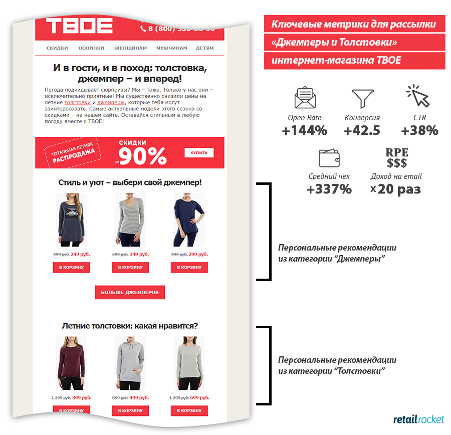 Например, подписчики интернет-магазина ТВОЕ были сегментированы по интересам, и точечная отправка с релевантным содержанием по выделенному сегменту «Джемперы и Толстовки» позволила добиться роста всех ключевых показателей рассылки: Open Rate на 133,95%, Click Rate на 38,33%, конверсии из переходов в заказы на 42,54%, а среднего чека на 337,29%. Рост ключевого показателя выручки на одно отправленное письмо (Revenue Per Email) составил 1917,17%.