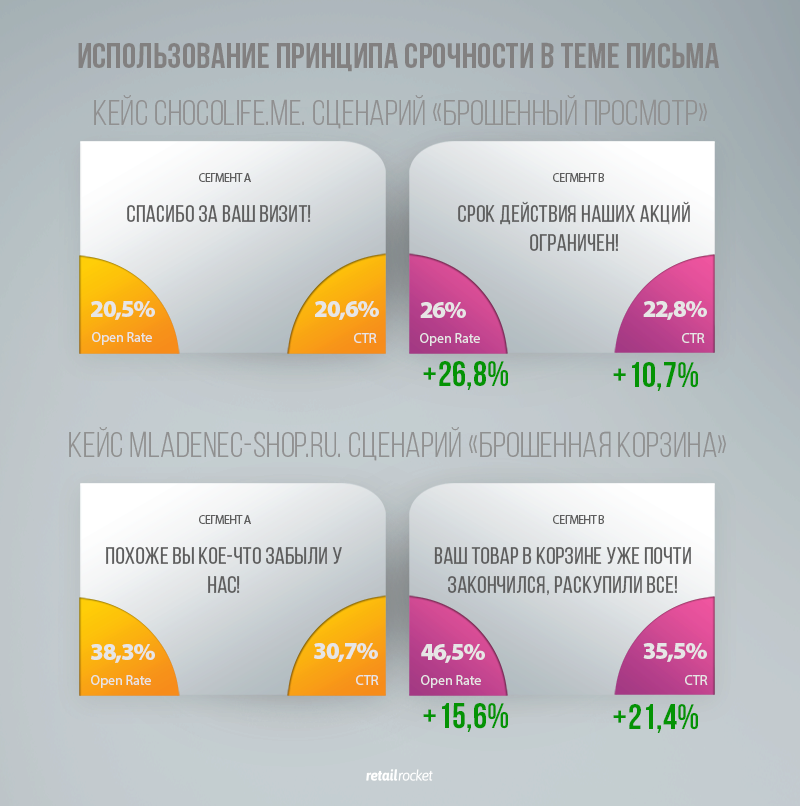 Тестируйте разные варианты, что найти самые эффективные выражения и стилистику для вашего магазина. По опыту Email Growth Hacker’ов Retail Rocket тема письма может не только увеличить Open Rate, но и обеспечить рост CTR и конверсии. Например, интернет-магазин chocolife.me за счет использования принципа срочности в триггерном сценарии «брошенный просмотр» смог увеличить Open Rate на 26,8% и CTR на 10,7%, а в интернет-магазину mladenec-shop.ru внедрение этого принципа в письмо о «брошенной корзине» позволило увеличить Open Rate на 15,6% и CTR на 21,4%.